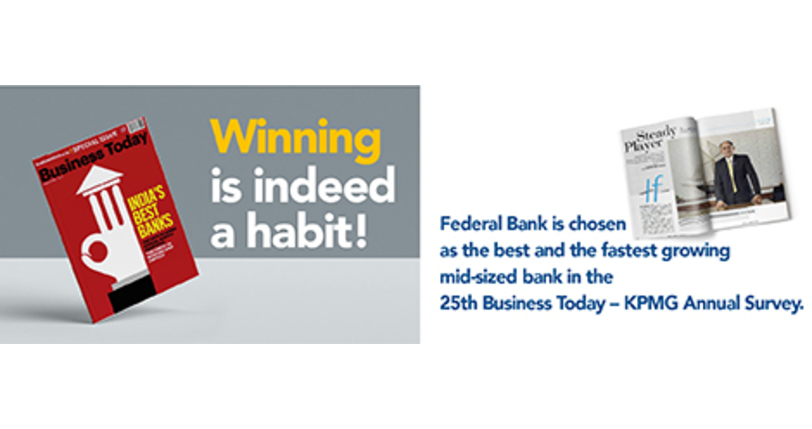 Federal Bank has won the "Best and the Fastest growing mid-sized Bank in the 25th Business Today - KPMG Annual Survey".