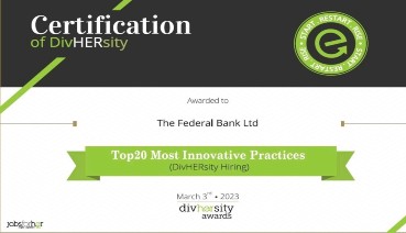 Federal Bank has been recognised for "Top 20 Most Innovative Practices - DivHERsity Hiring" in the AccelHERate & DivHERsity Awards 2023