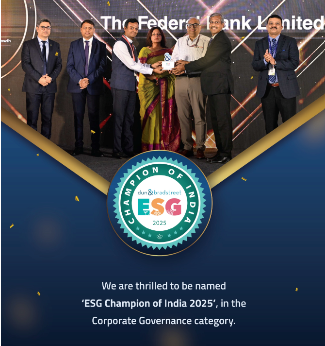 Federal Bank has been recognized as the "ESG Champion of India 2025" by Dun & Bradstreet, a prestigious honor awarded under the Corporate Governance category. This accolade underscores our steadfast commitment to excellence in governance and sustainable business practices. The announcement was made during the Dun & Bradstreet ESG Leadership Summit 2025, held in New Delhi on 27th June 2025.