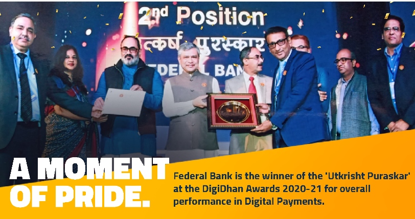 Federal Bank is the winner of the " Utkrisht Puraskar" at the Digi Dhan Awards 2020-21 for overall performance in Digital Payments