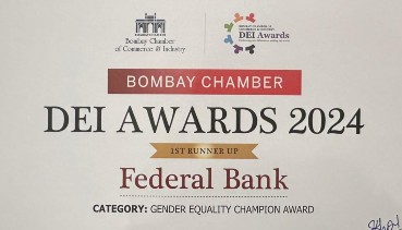Federal Bank bags the Gender Equality Champion Award at the Bombay Chamber's Diversity, Equity & Inclusion (DEI) Awards 2024.