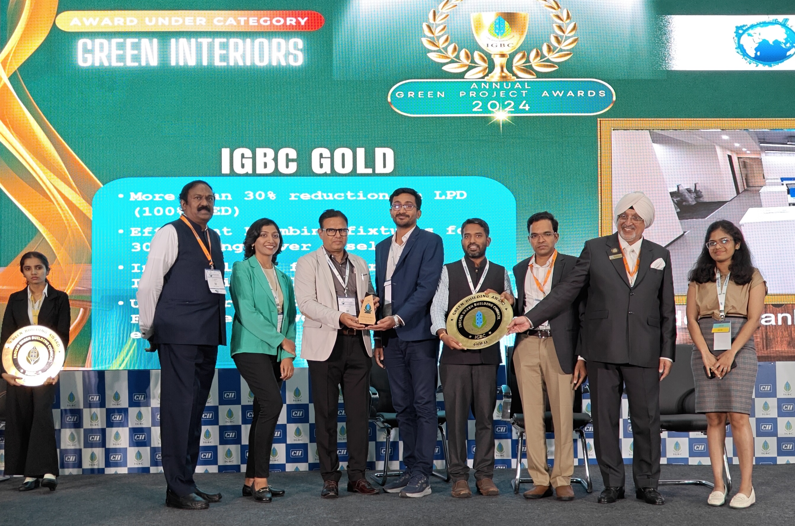 The recognition was presented to Arun Vas Gopal K and Sreeraj V from Corporate Services Department, by Shekar Reddy (Vice Chairman, CII-IGBC), and Sanjay Kulkarni (Chief Engineer of Environment, Pimpri Chinchwad Municipal Corporation), during the Green Building Congress 2024 held in International Exhibition Centre, Bangalore. Ram Prashanth Manohar, IAS (Chairman, Bengaluru Water Board), also graced the ceremony, which was held on 14th November 2024.